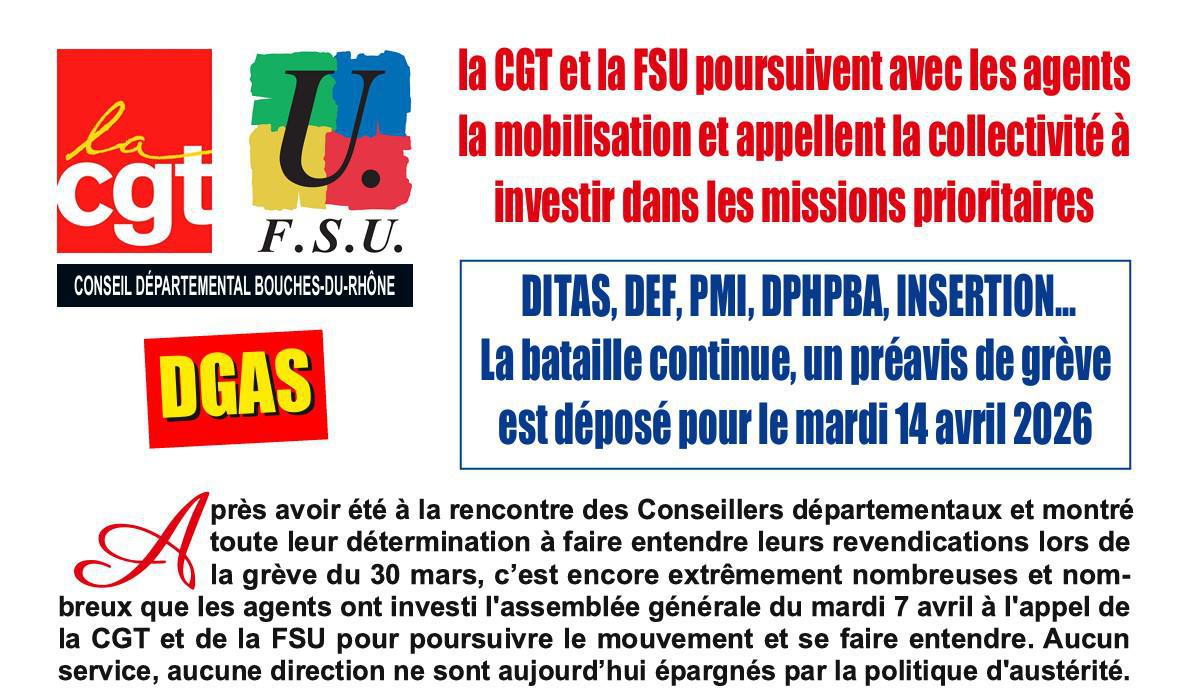 🚨🪧DGAS: LA MOBILISATION CONTINUE LE 14 AVRIL RDV à 8H00 à L'HÔTEL DU DEPARTEMENT